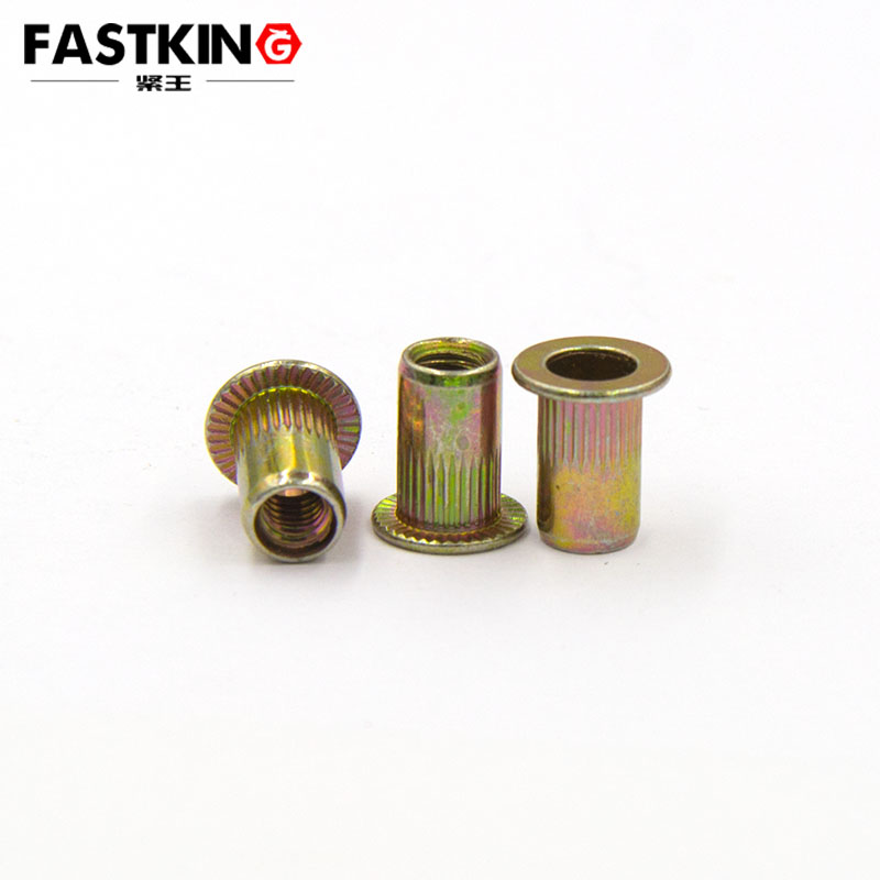 從核心構成來看,彩鋅拉鉚螺母由兩部分關鍵要素組成:一是拉鉚螺母本體,二是表面的彩鋅鍍層。拉鉚螺母本體通常采用優質碳鋼(如 1010、1015 低碳鋼)或不銹鋼材質加工而成,本體結構包含螺紋孔、法蘭邊、鉚接段三部分 —— 螺紋孔用于與螺栓配合實現緊固,法蘭邊可增大接觸面積、防止安裝時工件變形,鉚接段則是拉鉚工藝的核心,通過外力拉伸使鉚接段變形,與工件形成緊密咬合。而彩鋅鍍層作為 “防護外衣”,并非單一涂層,而是通過電解鍍鋅 + 彩色鈍化處理形成的復合鍍層:先在螺母表面沉積一層鋅層,再通過鉻酸鹽鈍化工藝形成彩色鈍化膜,膜層厚度通常控制在 8-12μm,這一厚度既能保證鍍層的附著力,又能提供充足的防銹能力。