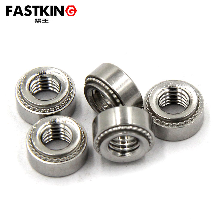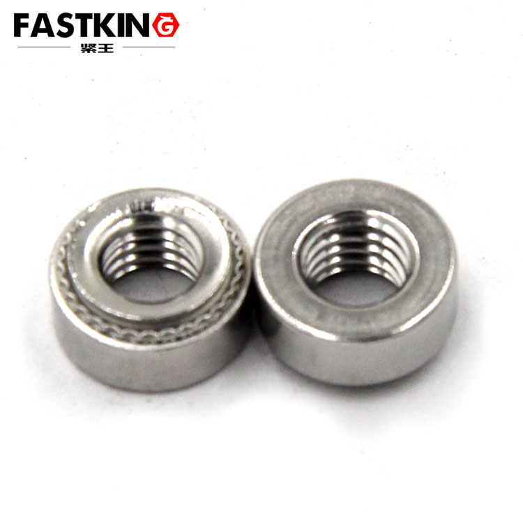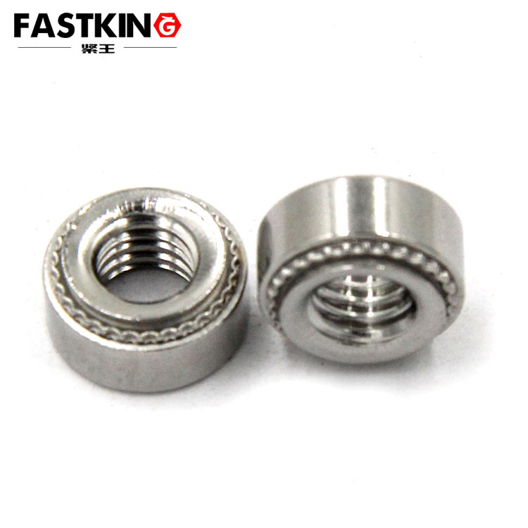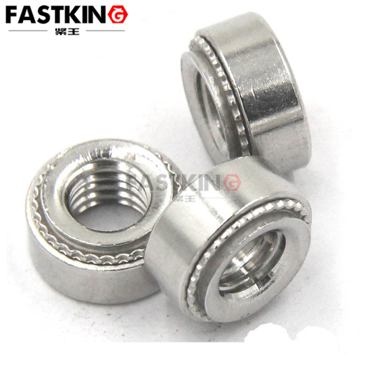 壓鉚螺母又叫鉚螺母,自扣緊螺母,是應用于薄板或鈑金上的一種螺母,外形呈圓形,一端帶有壓花齒及導向槽。其原理是通過壓花齒壓入鈑金的預置孔位,一般而言預置孔的孔徑略小于壓鉚螺母的壓花齒,通過壓力使壓鉚螺母的花齒擠入板內使預置孔的的周邊產生塑性變形,變形物被擠入導向槽,從而產生鎖緊的效果。